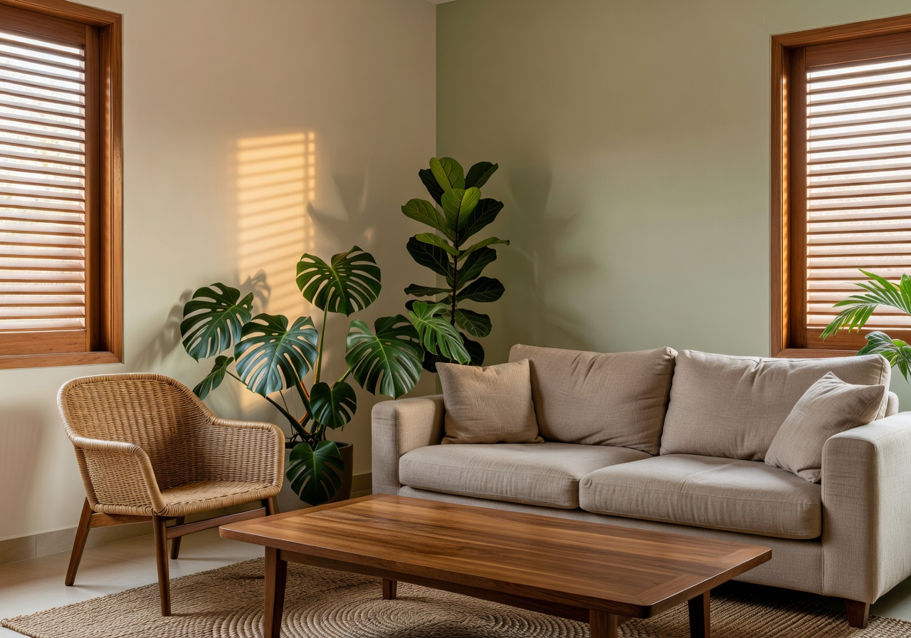 Dari ruang tamu biasa kepada ruang yang tenang dan premium dengan sofa linen oat, meja kopi walnut, dan cahaya keemasan semula jadi.